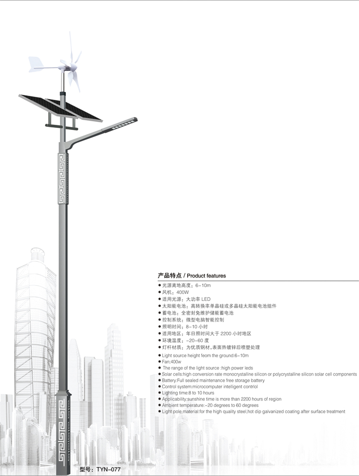 產(chǎn)品特點(diǎn):● 光源離地高度: 6-10m● 風(fēng)機(jī): 400W● 適用光源:大功率LED● 太陽(yáng)能電池:高轉(zhuǎn)換率單晶硅或多晶硅太陽(yáng)能電池組件● 蓄電池:全密封免維護(hù)儲(chǔ)能蓄電池● 控制系統(tǒng):微型電腦智能控……